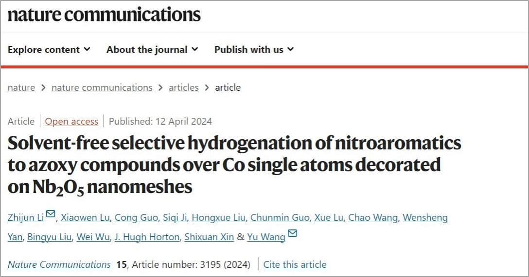 近日,我校多资源协同陆相页岩油绿色开采全国重点实验室成员、我院李智君教授在单原子催化领域取得重要进展,研究成果以《纳米网状Co1/Nb2O5高效催化硝基芳烃无溶剂选择性加氢制备偶氮化合物》(Solvent-free selective hydrogenation of nitroaromatics to azoxy compounds over Co single atoms decorated on Nb2O5 nanomeshes)为题,发表在《自然通讯》(Nature Communications)。
